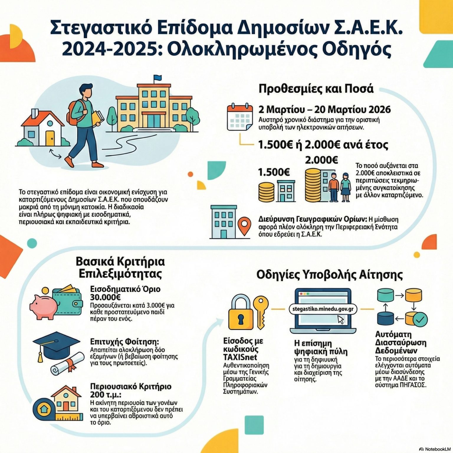 Η υποβολή αιτήσεων χορήγησης στεγαστικού επιδόματος για καταρτιζόμενους των Δημοσίων Σχολών Ανώτερης Επαγγελματικής Κατάρτισης (Σ.Α.Ε.Κ.) αρμοδιότητας του Υπουργείου Παιδείας, Θρησκευμάτων και Αθλητισμού (Υ.ΠΑΙ.Θ.Α.) για το εκπαιδευτικό έτος 2024-2025 αρχίζει τη Δευτέρα 02.03.2026 και ολοκληρώνεται την Παρασκευή 20.03.2026.